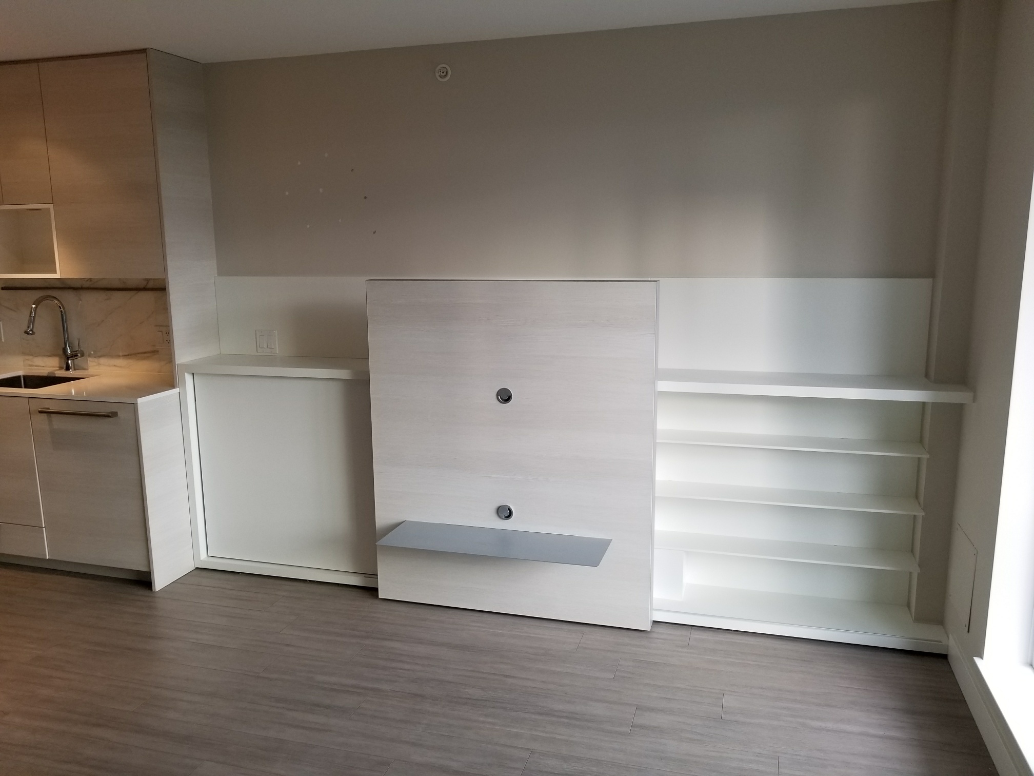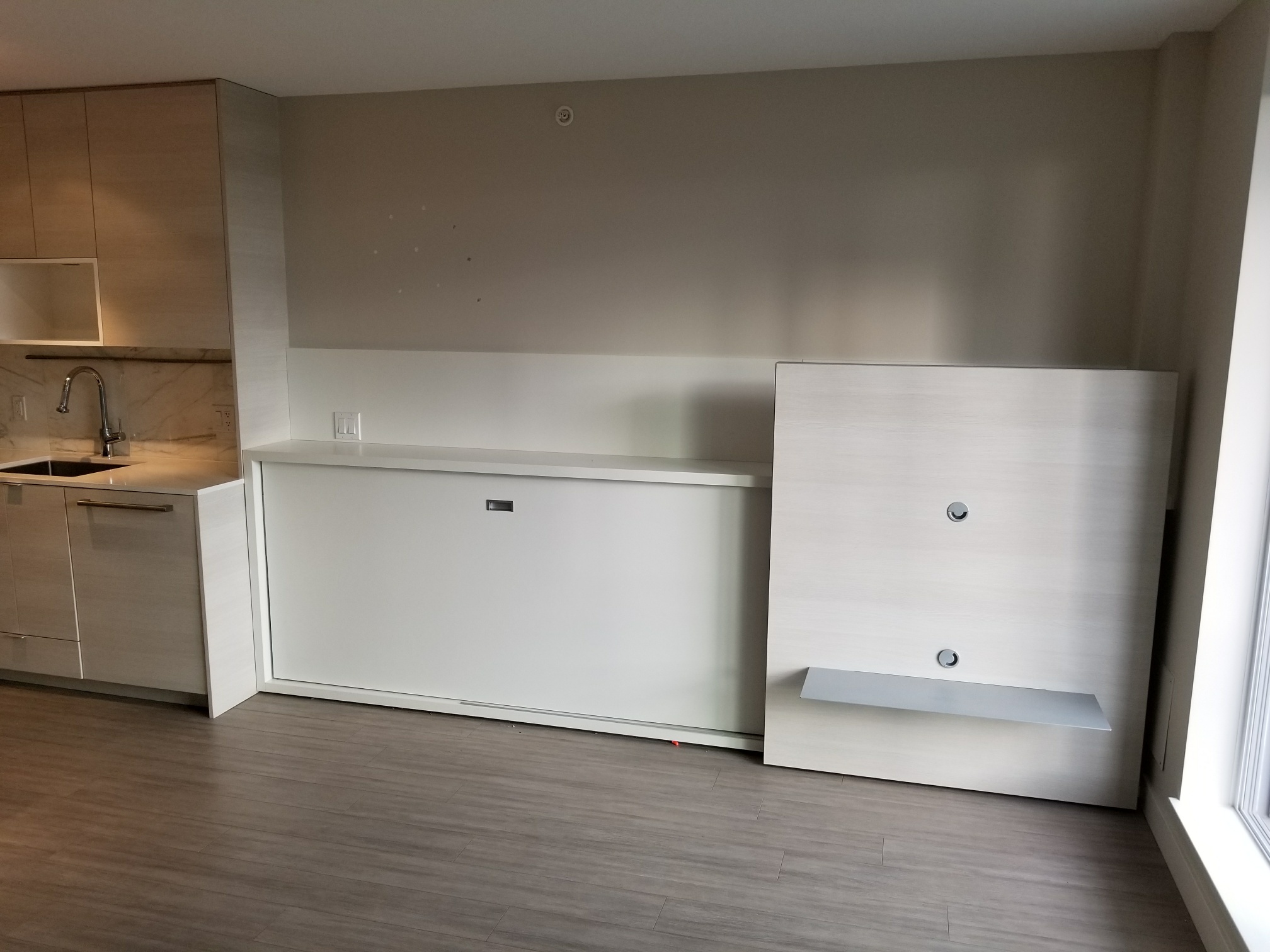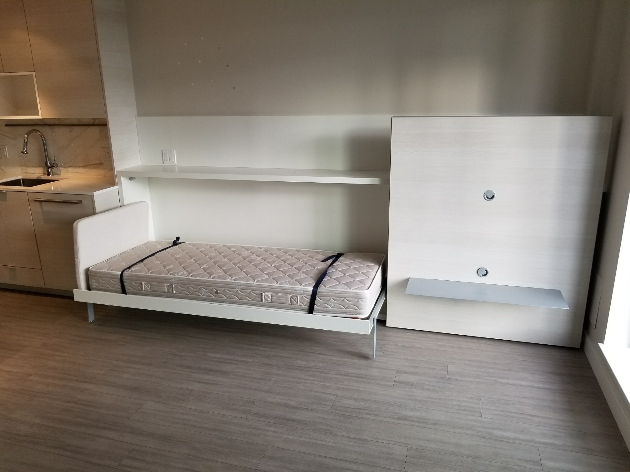 This unit comes partially furnished with a queen sized murphy bed, built in single bed and built in dining room table that can accommodate up to 8 people.