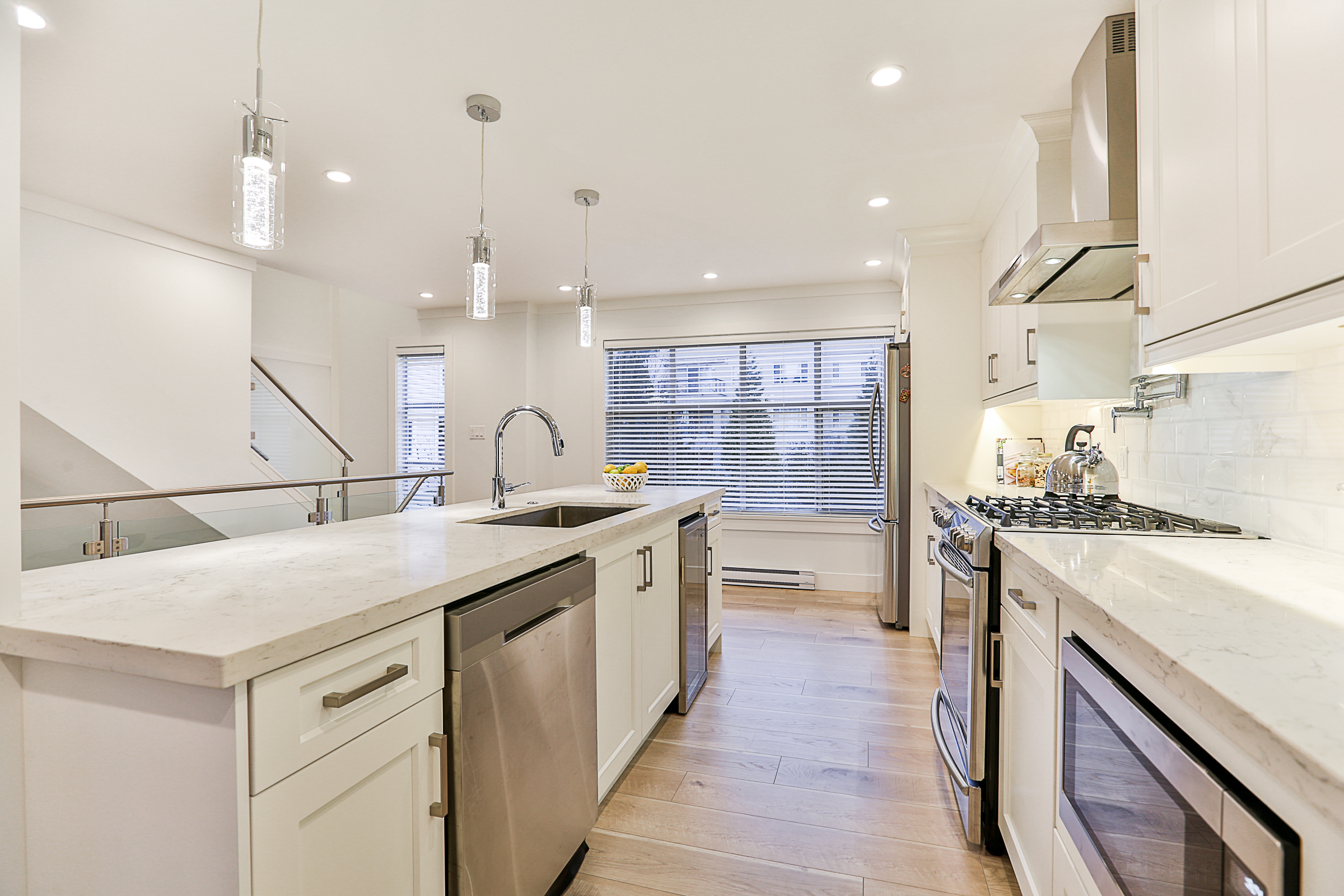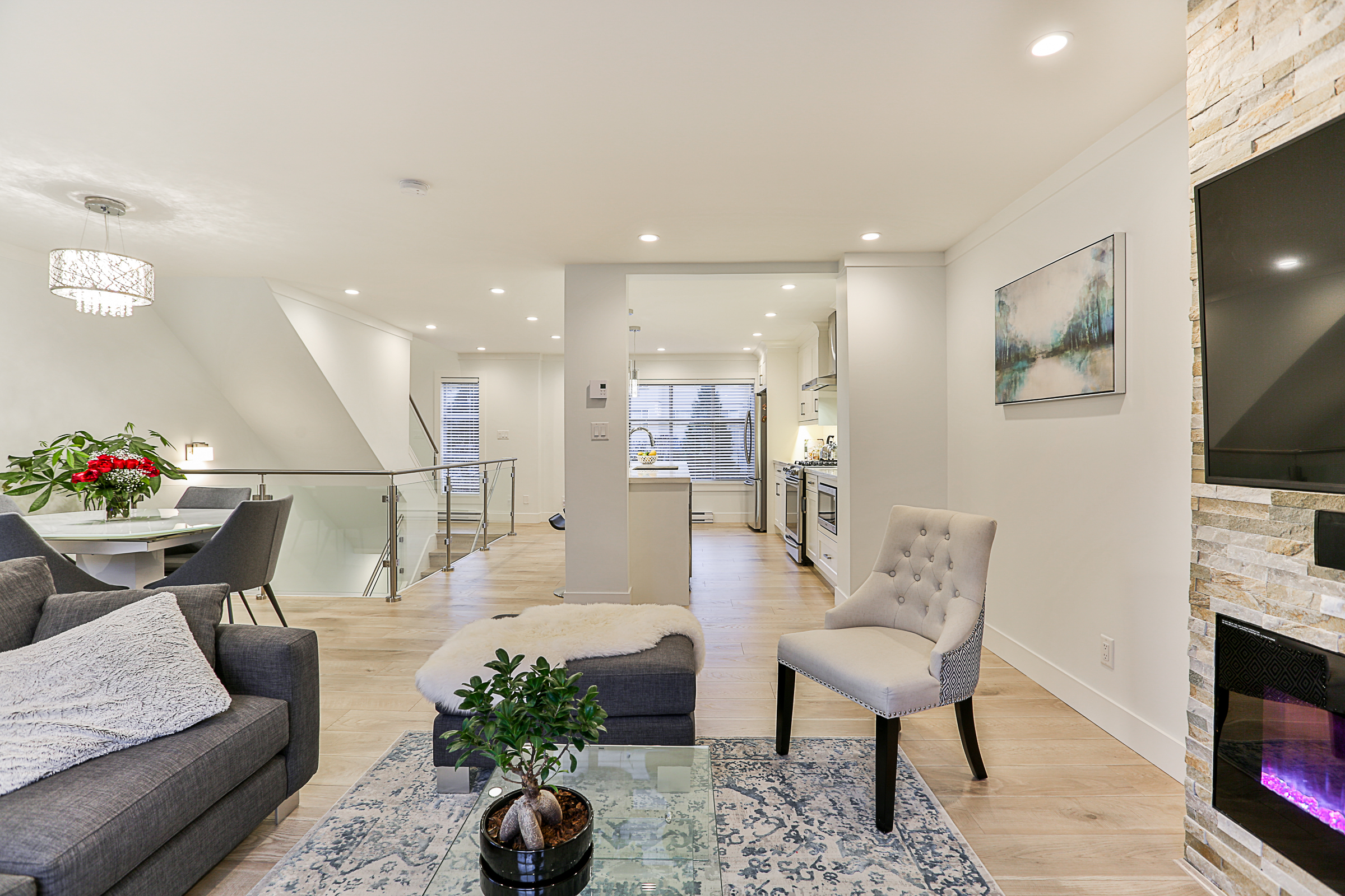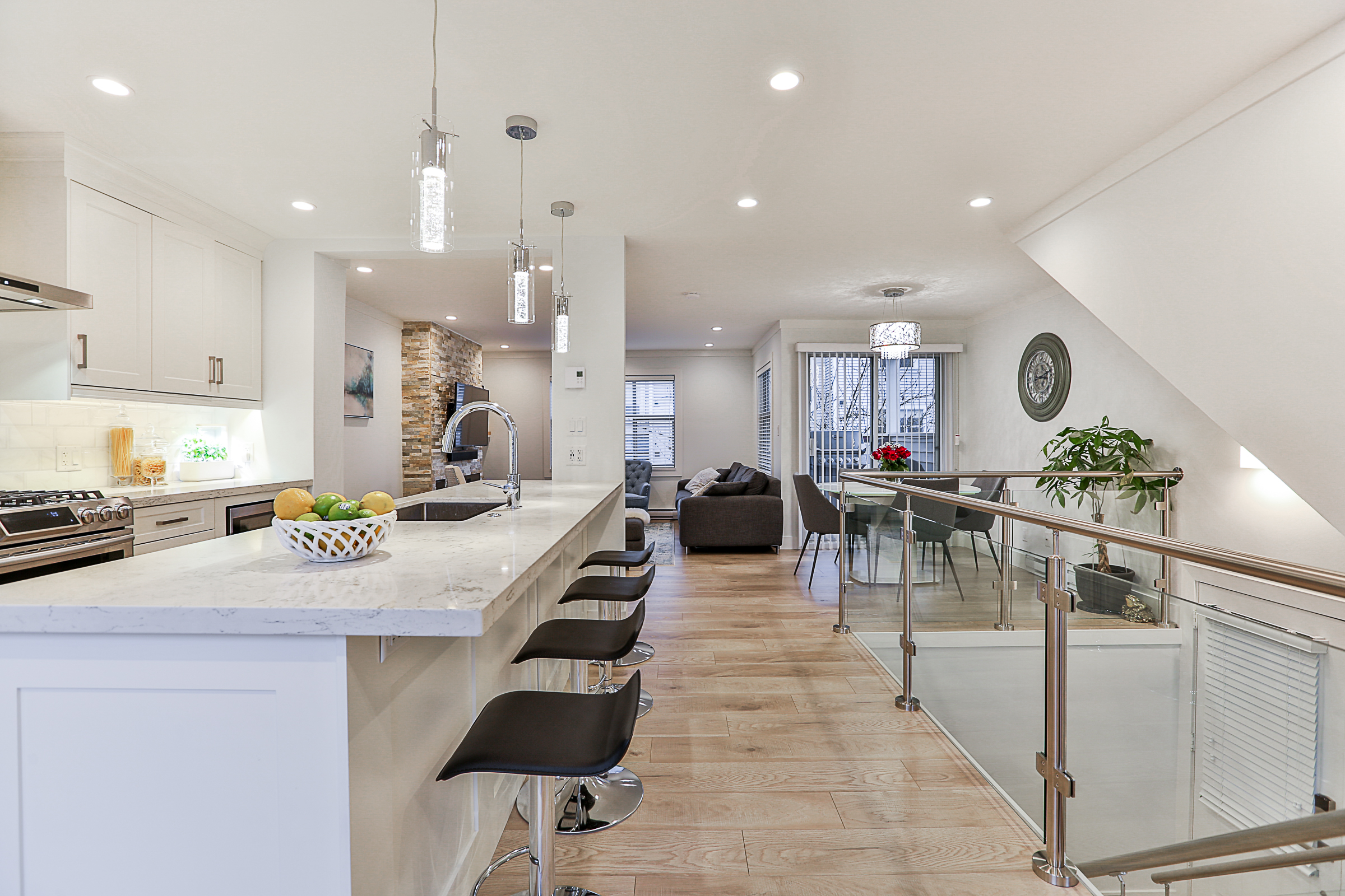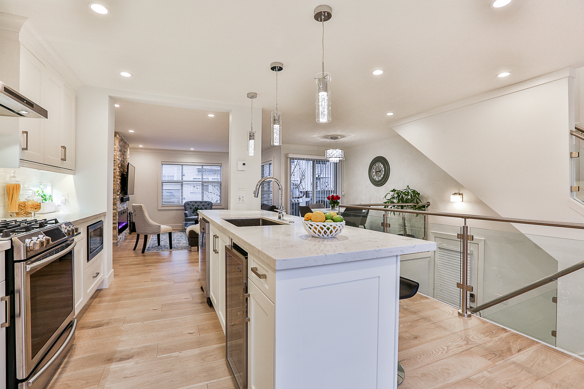 Fabulous 3 bed, 3 bath END UNIT Townhouse COMPLETELY RENOVATED with an open concept floor plan and meticulous attention to detail. The Gourmet Kitchen features brand new quartz countertops, upscale stainless steel appliances, gorgeous real wood cabinets, 10 foot + kitchen island with a built in wine cooler, Delta fixtures including a pot filler and more! Brand new flooring, glass and stainless steel railings, custom fireplace, blinds and lighting throughout. The enlarged ensuite has a stunning glass shower with heated floors and quartz counters. Recreation Room on the lower floor, a great patio, SIDE by SIDE double garage, situated in a family friendly complex.