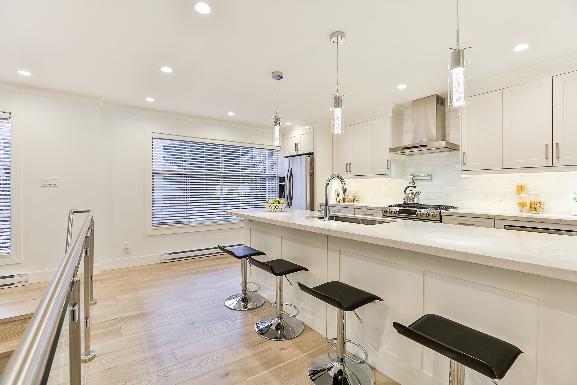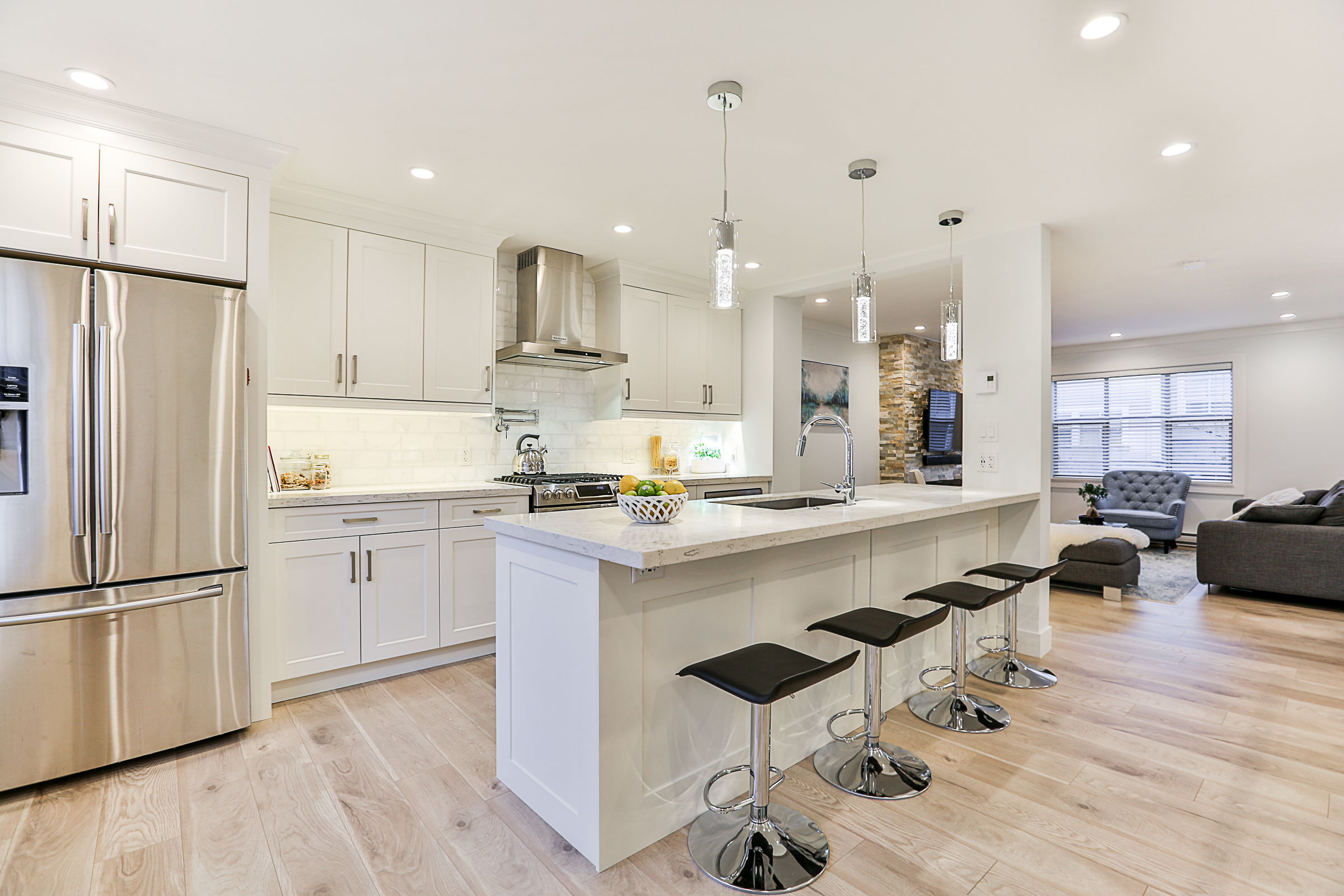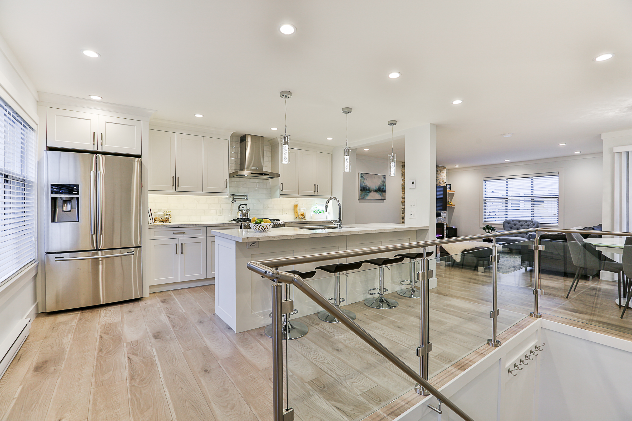 Fabulous 3 bed, 3 bath END UNIT Townhouse COMPLETELY RENOVATED with an open concept floor plan and meticulous attention to detail. The Gourmet Kitchen features brand new quartz countertops, upscale stainless steel appliances, gorgeous real wood cabinets, 10 foot + kitchen island with a built in wine cooler, Delta fixtures including a pot filler and more! Brand new flooring, glass and stainless steel railings, custom fireplace, blinds and lighting throughout. The enlarged ensuite has a stunning glass shower with heated floors and quartz counters. Recreation Room on the lower floor, a great patio, SIDE by SIDE double garage, situated in a family friendly complex.