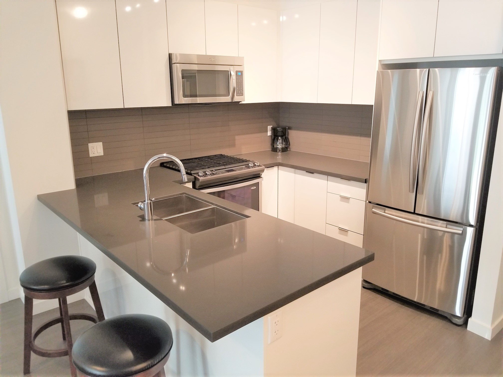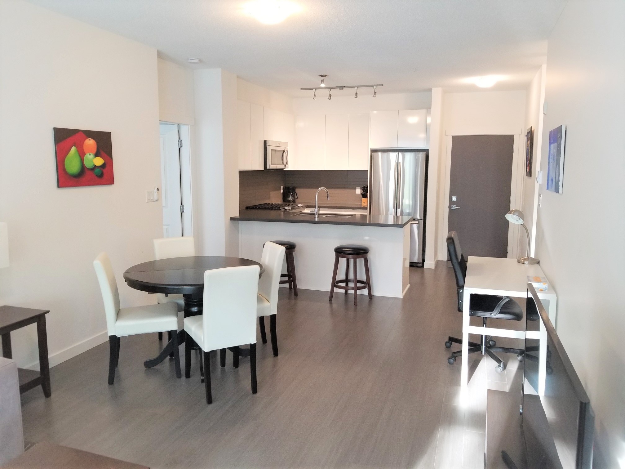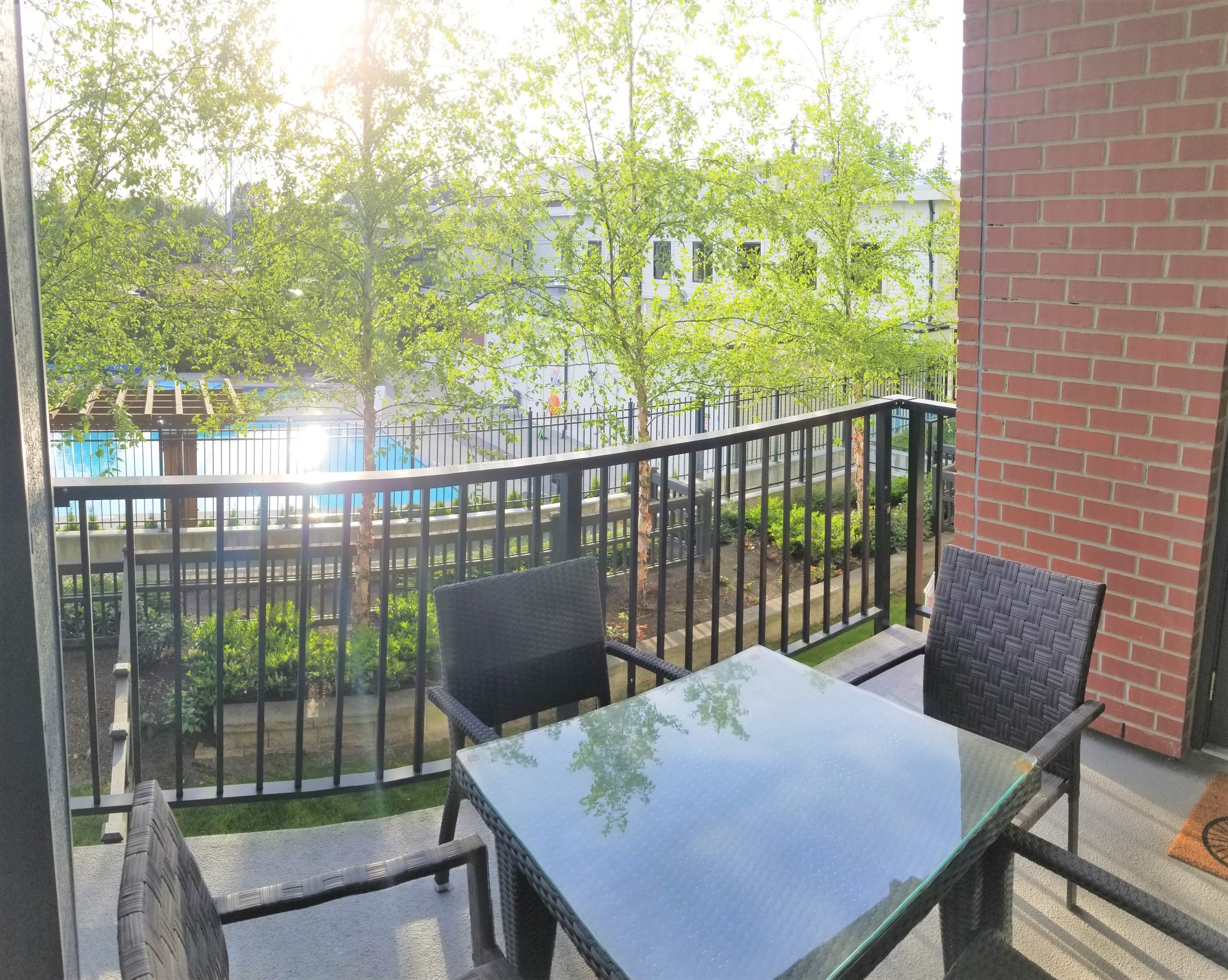 Fully furnished 2 bed, 2 bath contemporary East Coast-style apartment residence at the landmark master planned community of Harvard Gardens in South Surrey. This lovely courtyard and swimming pool facing unit is provides a tranquil setting with over 900 square feet of beautifully finished open plan space plus a large, private balcony to enjoy outdoor living