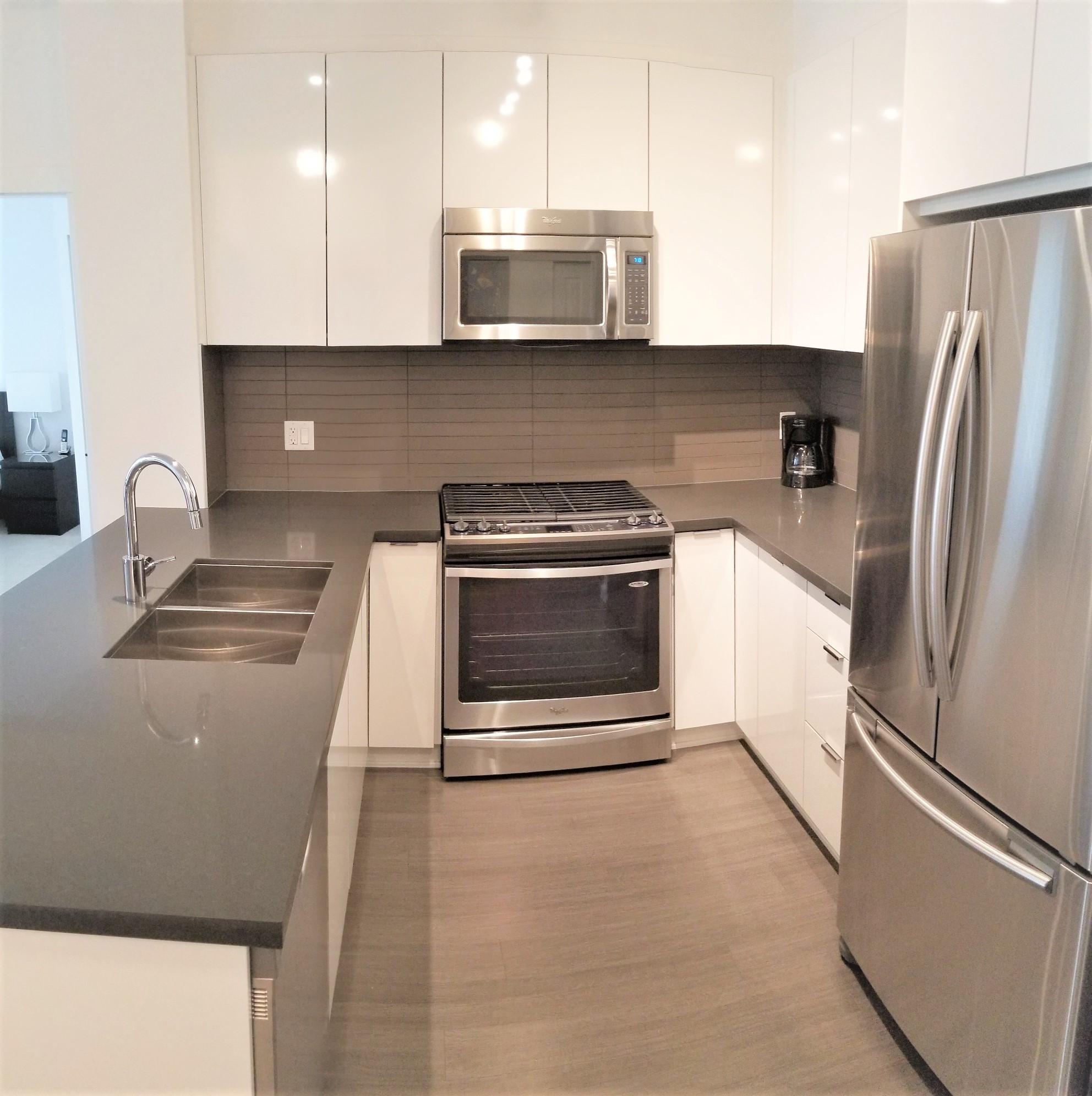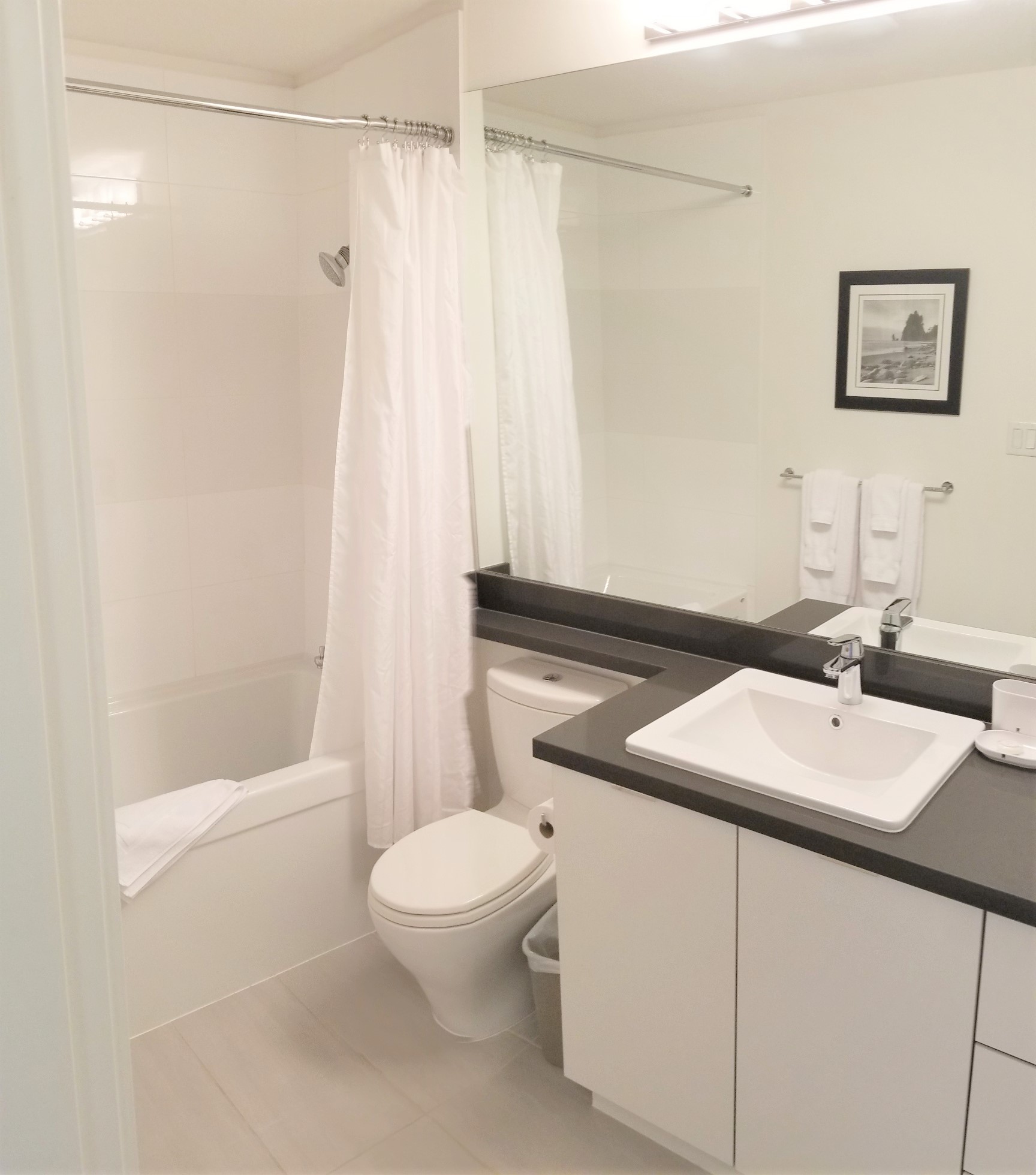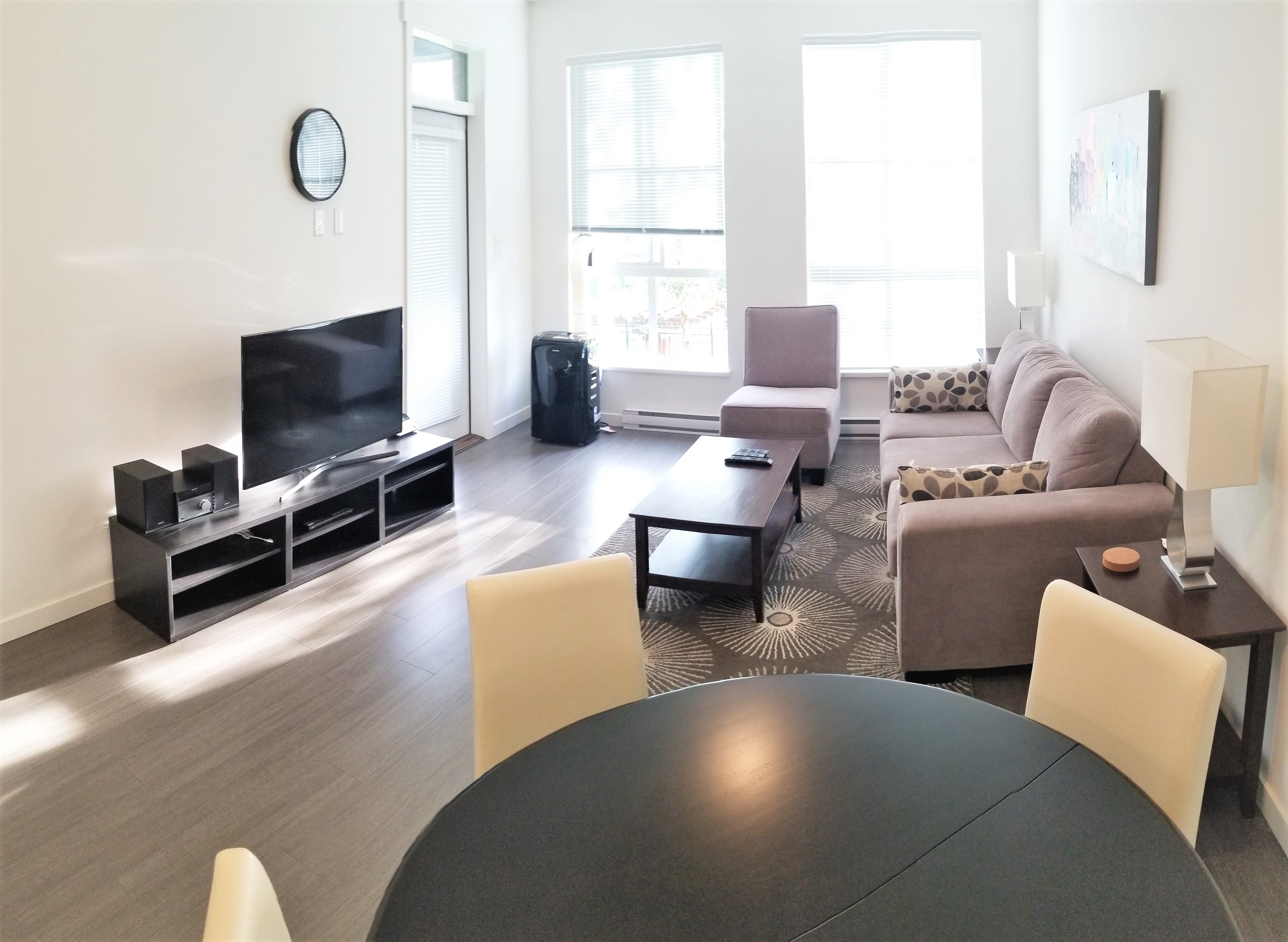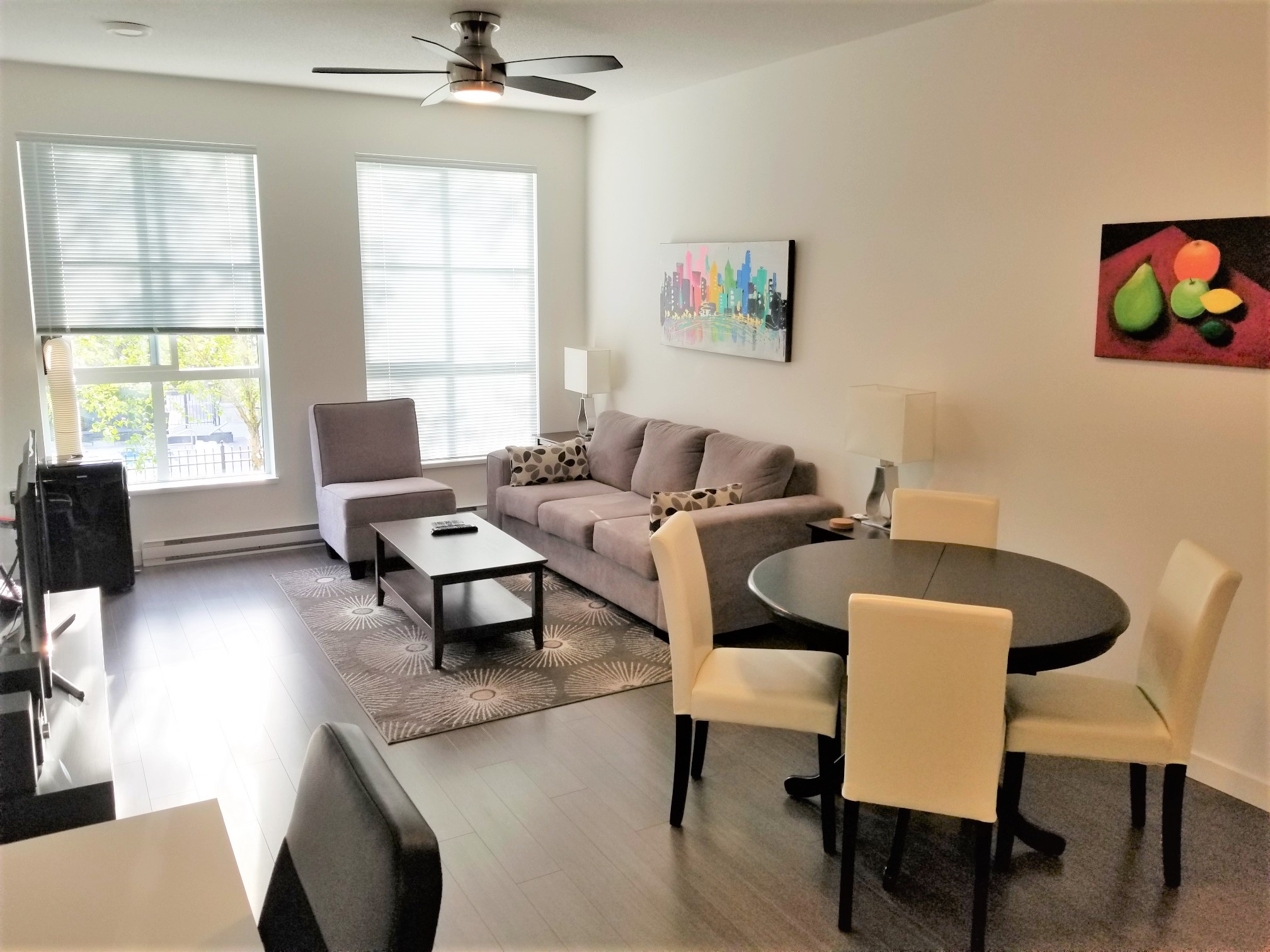 Fully furnished 2 bed, 2 bath contemporary East Coast-style apartment residence at the landmark master planned community of Harvard Gardens in South Surrey. This lovely courtyard and swimming pool facing unit is provides a tranquil setting with over 900 square feet of beautifully finished open plan space plus a large, private balcony to enjoy outdoor living