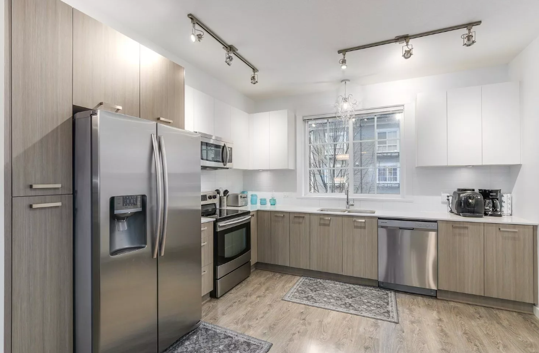Rarely available! Welcome to this beautiful 1200 square foot 3bed/ 2bath townhome in the highly sought after Riverwood-Fremont area. Beautiful Georgian-inspired homes are lined up on welcoming, manicured streets. This home is impressive from the moment you walk into your natural wood accented foyer. There’s a bedroom/den on this level complete with a three-piece bath, not to mention a huge garage! The main living level features 9' ft ceilings & extra windows which light up the open concept living space. The kitchen is huge and features an island, full size SS appliances, quartz counters & and dedicated dining area. You’ll love the large balcony! Both bedrooms upstairs are master sized & separated by a full bathroom. Enjoy being minutes to shopping, restaurants, cafes, trails, public transit & fantastic schools. This Fremont Village area neighborhood is just minutes to Walmart, Costco, Save-On and more! A fantastic walkable location, also great for commuters!
