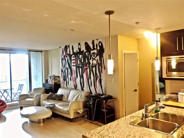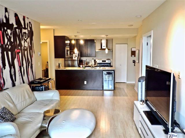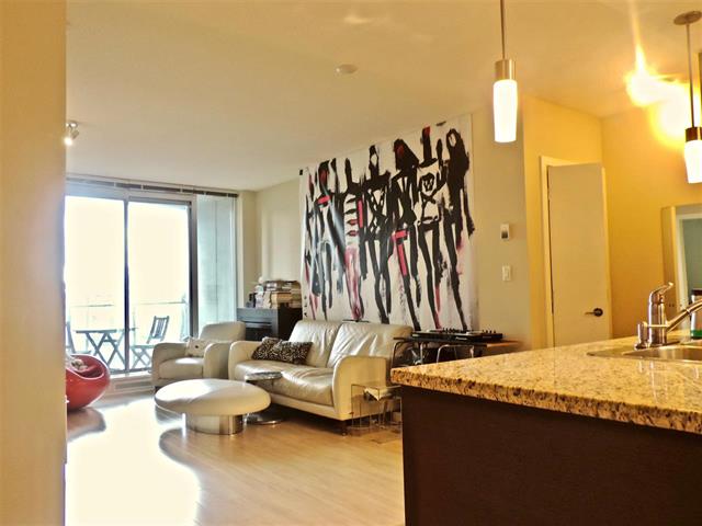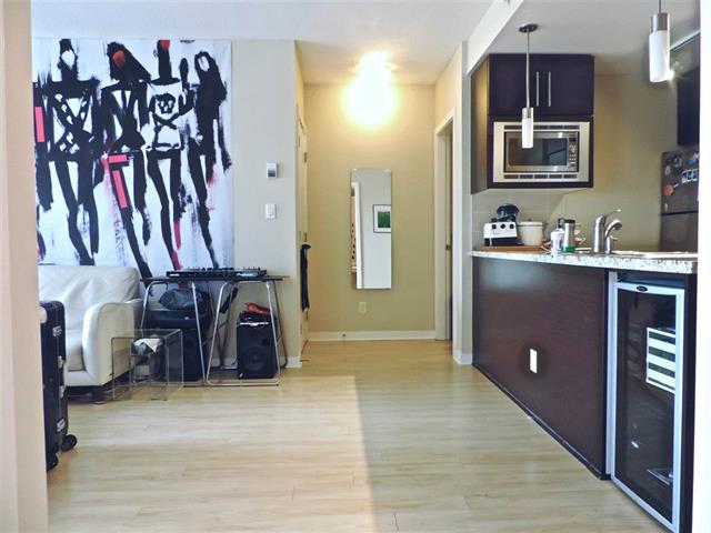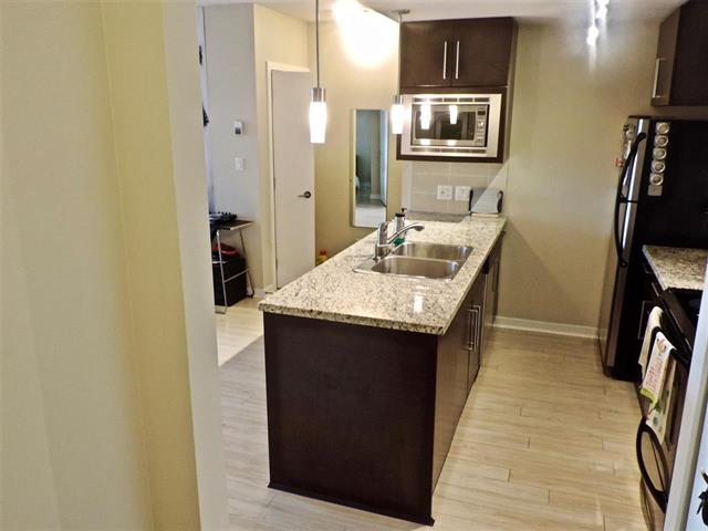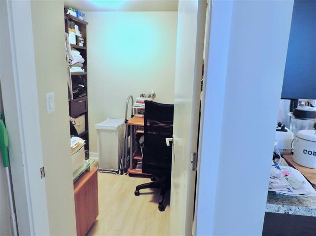 Centrally located 1 bedroom & flex (Larger den) condo in mid rise ESPANA building featuring a Gourmet kitchen with stainless steel appliances, a wine cooler, granite counter tops, laminate flooring & modern fixtures.