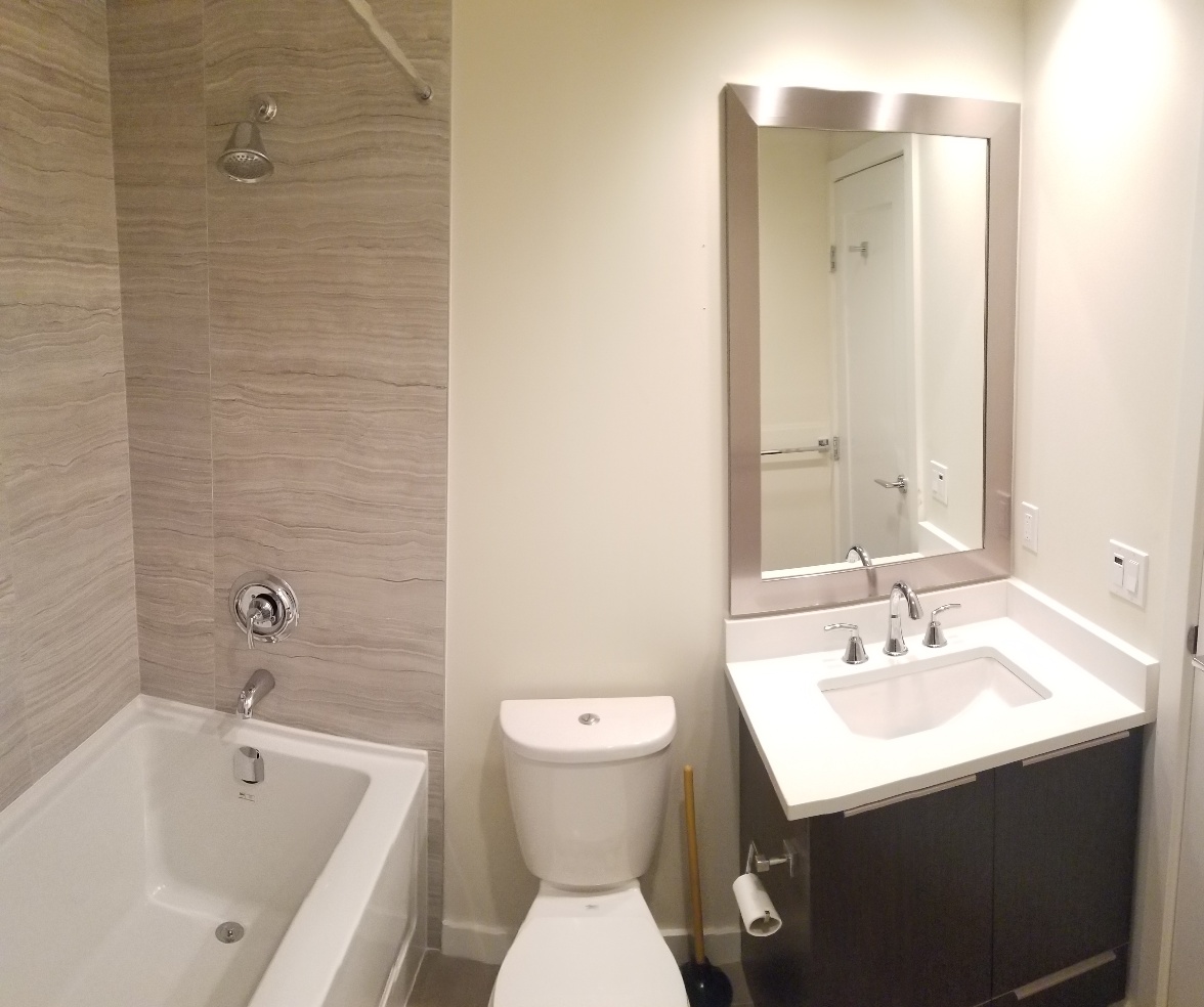 This open layout 2 bedroom + 2 bathroom has spacious living area, and own personal deck as outdoor space, towards the amenity building.