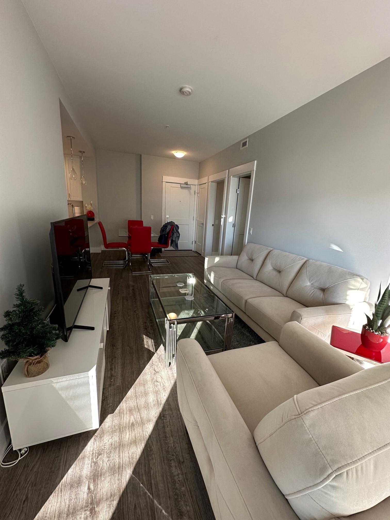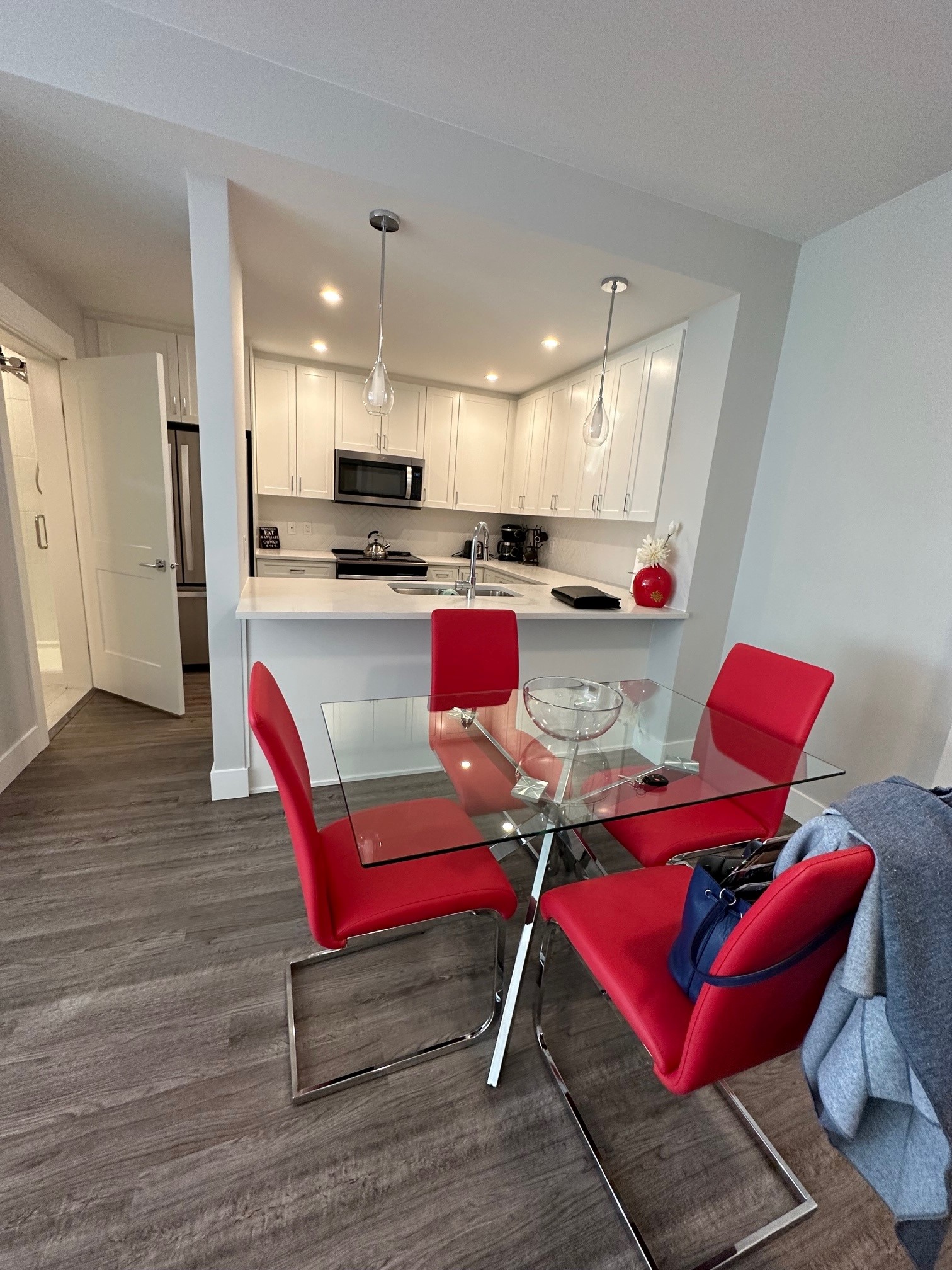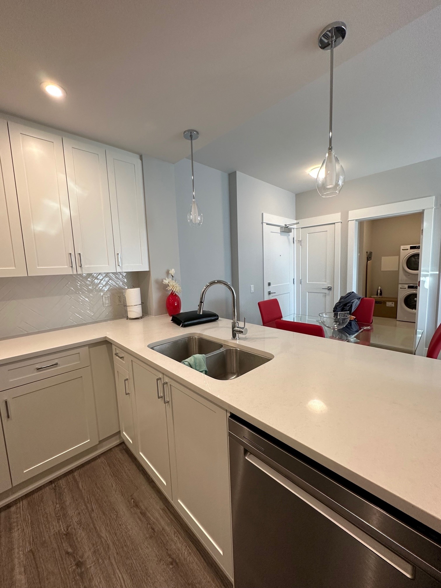 This like new spacious 2-bedroom 1-bath condo has been thoughtfully designed and features lush carpet in the bedrooms, kitchen with stone counters, modern appliances, lots of counter space, and in-suite laundry in a roomy laundry space.