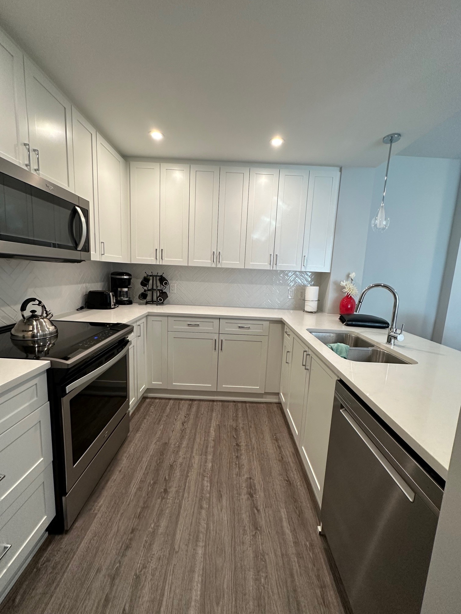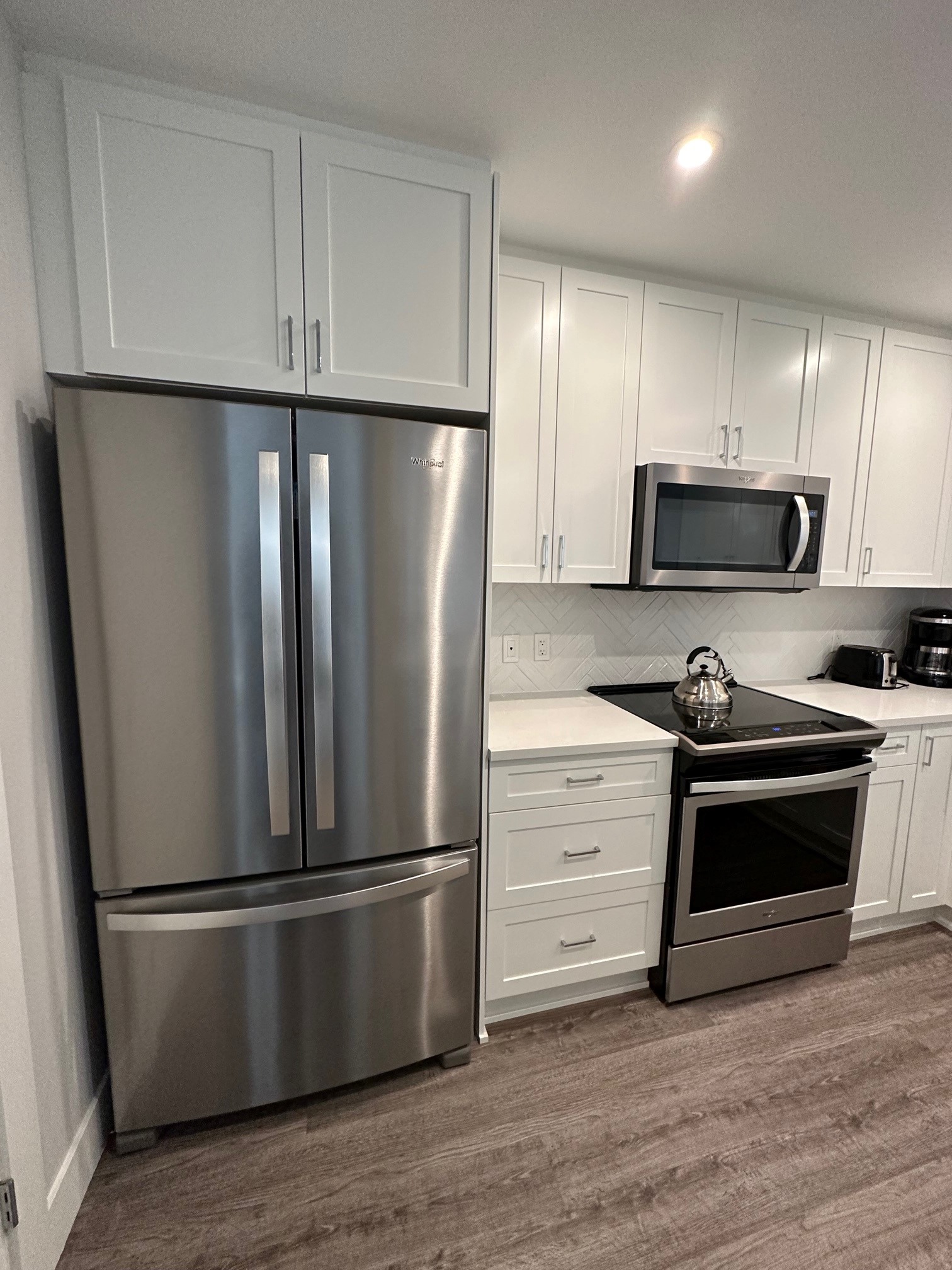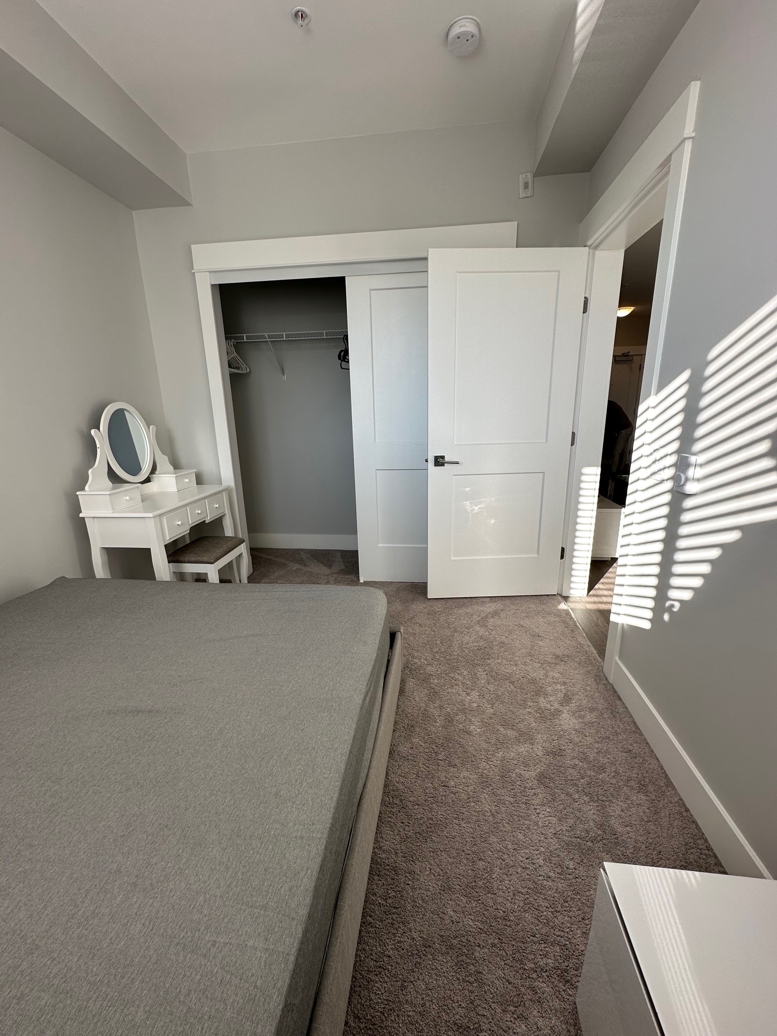 This like new spacious 2-bedroom 1-bath condo has been thoughtfully designed and features lush carpet in the bedrooms, kitchen with stone counters, modern appliances, lots of counter space, and in-suite laundry in a roomy laundry space.